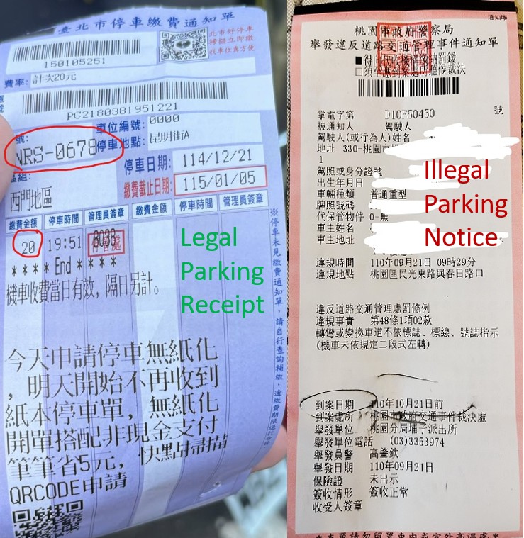 - Parking (<250cc): In Taiwan, parking regulations are strict, and distinguishing between a parking receipt and a fine is essential. Here is the corrected information regarding parking and penalties: